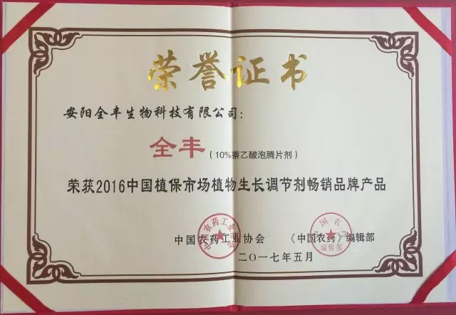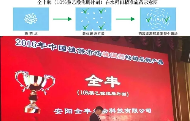同時,全豐牌10%萘乙酸泡騰片劑榮獲2016年中國植保市場植物生長調(diào)節(jié)劑暢銷品牌產(chǎn)品。日子美(20%赤霉酸可溶粉劑)榮獲2016年中國植保市場最具市場爆發(fā)力品牌產(chǎn)品。