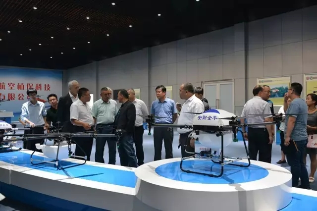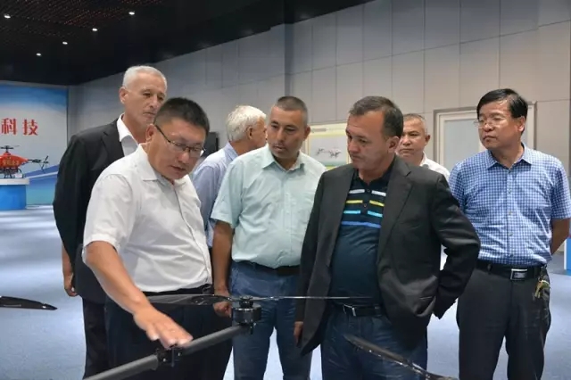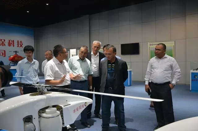 考察團(tuán)一行在全豐航空董事長(zhǎng)王志國(guó)的陪同下,首先參觀了無(wú)人機(jī)展廳。當(dāng)王總介紹3WQF120-12型油動(dòng)單旋翼植保無(wú)人機(jī)時(shí),塔沙耶夫和隨行專家詳細(xì)詢問(wèn)了該款機(jī)型的載重及續(xù)航能力,每天的作業(yè)量有多少,一天能夠起飛多少個(gè)架次,邊聽(tīng)介紹邊讓工作人員詳細(xì)記錄下來(lái)。
